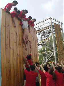 最后一個(gè)是“畢業(yè)墻”項(xiàng)目,在該項(xiàng)目中需兩個(gè)隊(duì)合二為一,4 米多高的“畢業(yè)墻”,要求所有隊(duì)員不借助任何外力的情況下全體員工都翻越過(guò)去,這對(duì)于整個(gè)團(tuán)隊(duì)來(lái)說(shuō)都是非常嚴(yán)峻的考驗(yàn)。