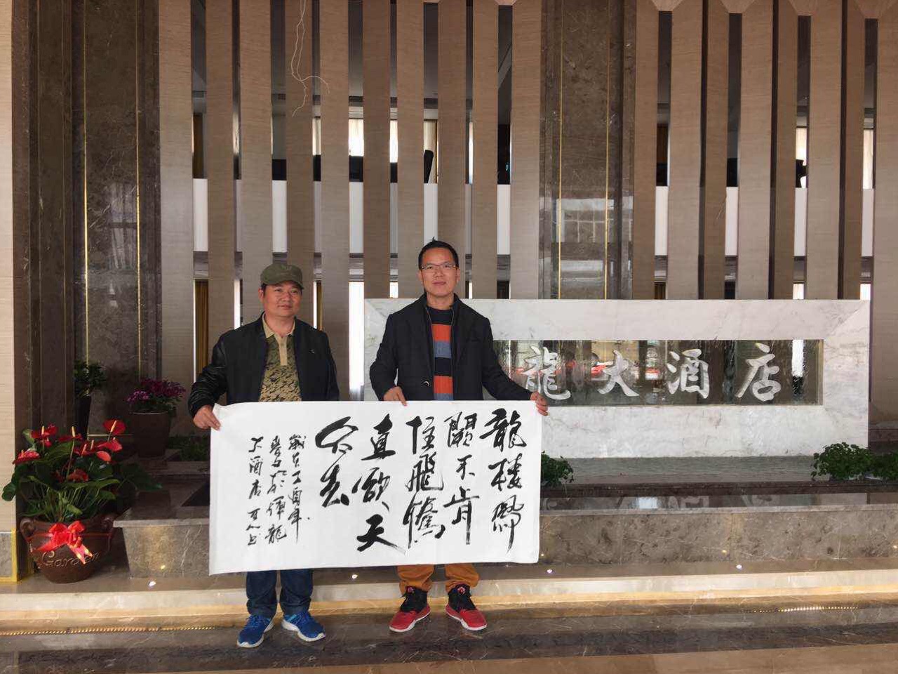 | 董事長(zhǎng)與書(shū)法展作品在大廳的合影 |