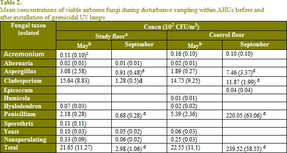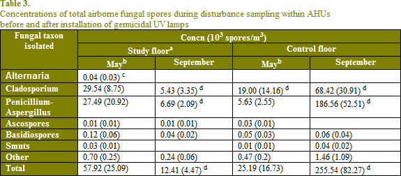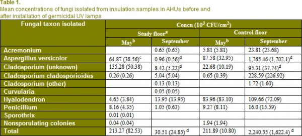 前的UV燈被啟動,在五月,意味著從兩個層上的絕緣層的總真菌濃度類似的類型和數量(見表1),而研究地板上可行的真菌在空調機組的總濃度在秋季和控制樓顯著的不同。