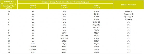 一個“整體”的報告值的52.2評??價空氣過濾器的最低能效報告的價值(MERV)的表達。MERV是單一的數,即用,隨著在測試進行的空氣速度,以簡化的試驗方法,所產生的大量數據。MERV表示上的16點的規模和來自從PSE的三組中的每個。(見表3:MERV參數)。 平均PSE為每個三組(E1,E2和E3)是參照的最小效率報告值參數(見表3:MERV參數)。向上移動的適當的范圍組(E1,E2和E3)在表3中,并記錄MERV到左側的第一個真正的語句。所有三組。 表3:MERV參數